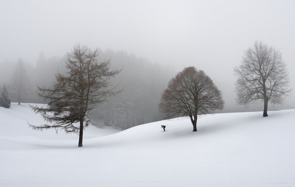 Last winter I spent some days in the Bavarian Alps. The weather was not what I hoped it would be, it was overcast and snowy and around 0°C. On one of my walks I discovered an area, which is a gold course in the summer, explaning its strange appearance.