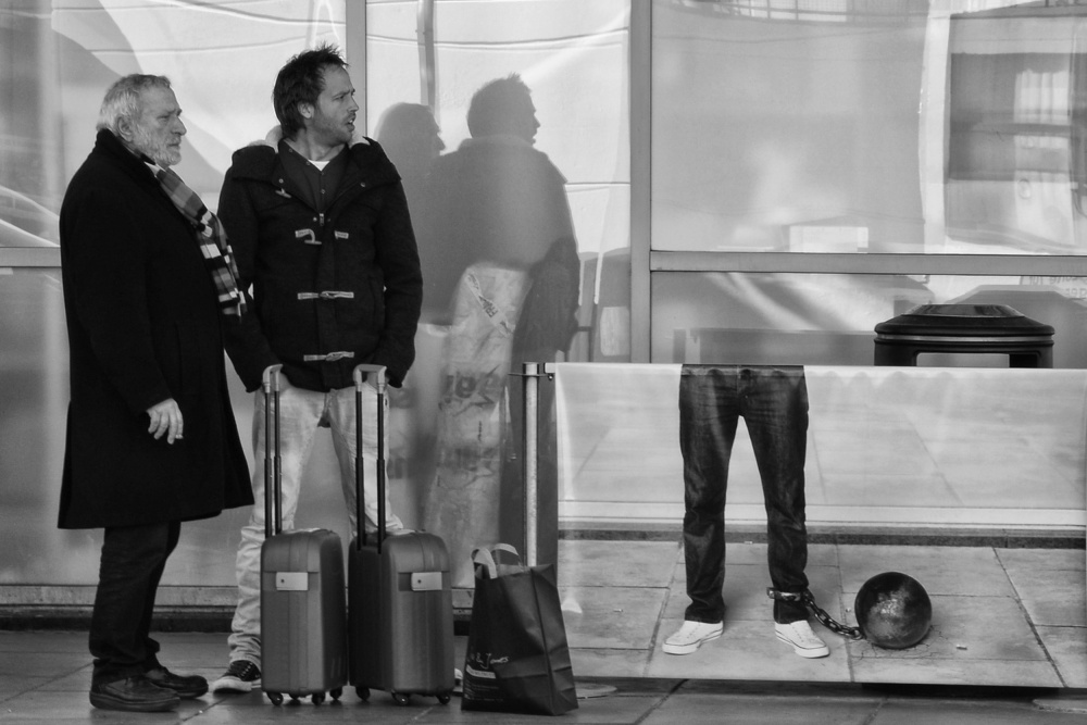 While the older man is just looking into some void - just like the dark object at the right of the photo - the younger seems to be rather astonished, which is strengthened by his shadow. It is as if he realises that something is missing, but he doesn’t seem to be disturbed by it. It is just a fleeting moment, caught at the right time by the photographer.