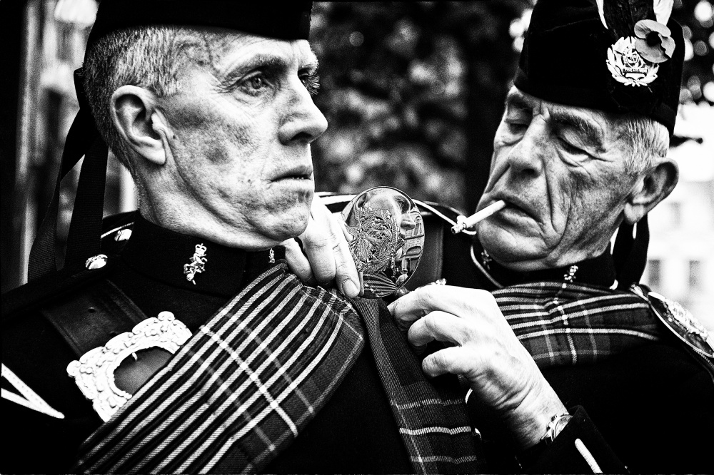While the surrounding people at this public gathering seem to bestretching their necks in order to miss nothing of what is going on in front of them, this man sat down. Tired and seemingly lost in thoughts, or overwhelmed by emotions perhaps. The scene reminded me of Henri Cartier-Bresson who in a report on the coronation of King George VI had more interest in the crowds than in the pomp and circumstance. It is the same here. Hans Knikman is interested more this man with his expressive eyes, sitting on the sidewalk, than in the things that happen in front of the crowd. It is also a portrait of an individual, who created his own space in the midst of an anonymous crowd. It is as if the photographer wants us to show, that any mass gathering consists of individuals, just like this man here on the sidewalk.