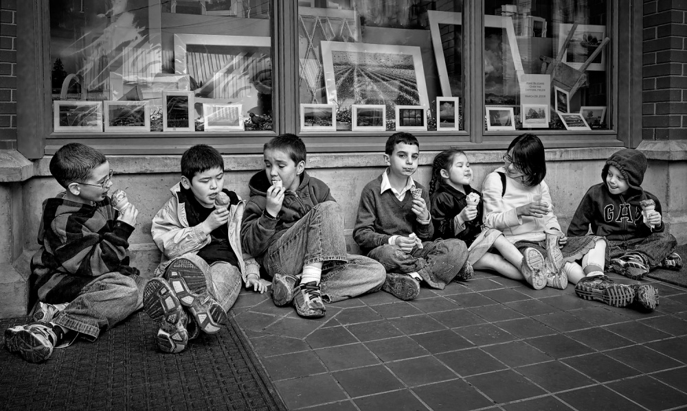 There is the calm, almost documentary approach of Barbara Read with her street shot of a group of children enjoying their ice cream outside the ice cream shop. Opposite this calm street image is the dynamic picture of Peter Hrabinsky. Lively little guys who almost seem to be dancing before the camera whileflashing the “sign of the horns”. Both photos give an inside view of two very different worlds and their realism, theme and often interactive qualities, are representative of the photographic approachin street photography.