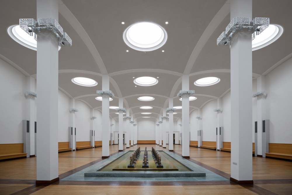 The spacious hall is conceived as a place of quiet reflection, which is very well caught here in this photograph by Dick Heckmann. It appears like entering a temple. The atmosphere is serene - as if never disturbed by visitors - but also a bit serious. Dick emphasizes this by concentrating on the strict symmetry of the hall and its repetition of forms, which is only broken by the more playful lamps in the ceiling and the arches. If he had chosen another point of view, the impression would have been quite different.