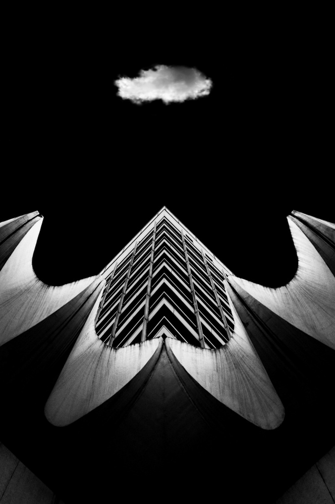 Carambola is a tropical fruit. It is also known as star fruit and has five to eight prominent longitudinal ridges. And yes, it resembles the building that Michael Köster photographed in Berlin. Between brackets, I must confess I had no idea what a carambola might be, so I googled a bit and found out that there are also lamps with that name. One of our 1X photographers had associations with a huge bird flying high to the clouds. That's also what I saw when viewing this image. Whatever you see - it might even be a kite - Michael did a great job. He eliminated all details that could distract the eye, while processing the image into lovely black and white. The little cloud is the icing on the cake. It gives you an idea of spaciousness and directs the eye. It is as if one flies towards it and beyond.