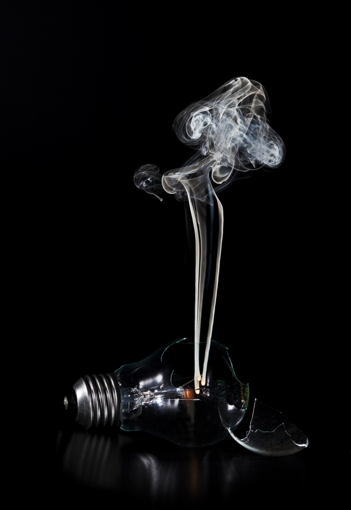 In the winter when it's cold outside and there are only a few hours of daylight, I like to shoot indoors. I try to create effective yet simple, minimalistic photographs of everyday objects. On this day, I decided to smash a light bulb and photograph the shapes of the smoke that the glowing filament produced.