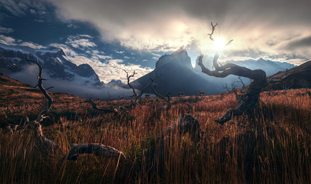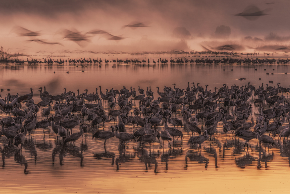 A wonderful image that combines the photograph's subjects in a simple story, featuring soft lighting, an inviting color palette and a good use of visual presentation by cropping the image to more of a panorama format, allowing the image to work both as landscape photograph and a wildlife photograph. Absolutely wonderful!