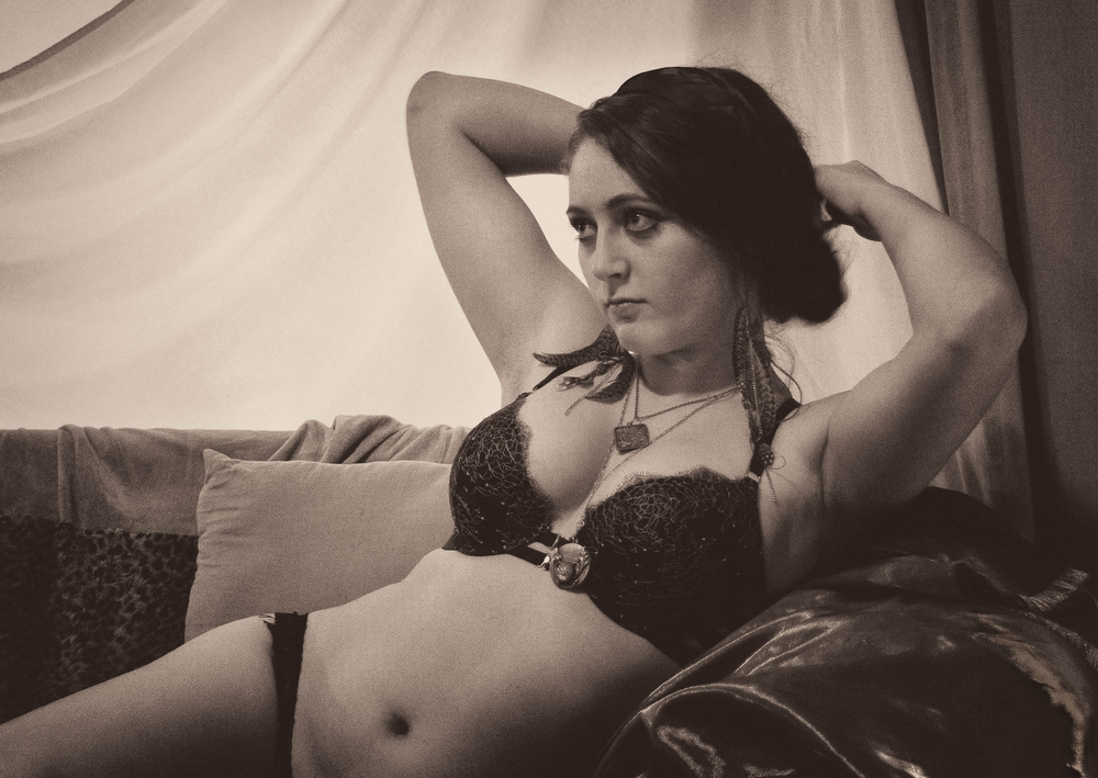 Some things I really like and about some I could suggest a few options so hope you stay with me - everything I write is just positive and of course, strictly subjective :) Starting with the things I like - the styling and the processing are pretty strong. Maybe one less medallion could be also a good choice. The toning is good and well chosen but you have marked this too. Good nuances and shadows, well controlled the light. The shutter speed was quite slow so also a good work. The noise carries a feeling of old time work, the accessories are also in the retro boudoir mood. What I find the biggest issue is the exact moment you captured - seems like the middle of a gesture, unfinished movement o preparation for something that will follow to me. The pose is good, the composition is a little strange. Not that I find it wrong but something slightly disturbs me and if me editing here I would probably crop a centimeter from the bottom of the image. Now, looking again I just cannot say for sure if this could please me enough - now it seems that the upper part of the body is too big in the frame and cutting from the bottom of the image could harm even more... I just miss more of the body. Still, you could check your other images and see if there is a different compositional option. The right side of the image - the Sofa seems to have some leather and there is one strong reflection that pulls a little the attention. The background is quite bright but I do not see this as a trouble, just a little detail around the right arm could increase the fluent perception of all elements in the picture. Also a slight detail development in the darkest part of the hair could be something - considering the bright background now it just feels a little like spot to me. Finally some brightness on the face and especially in the eyes :)