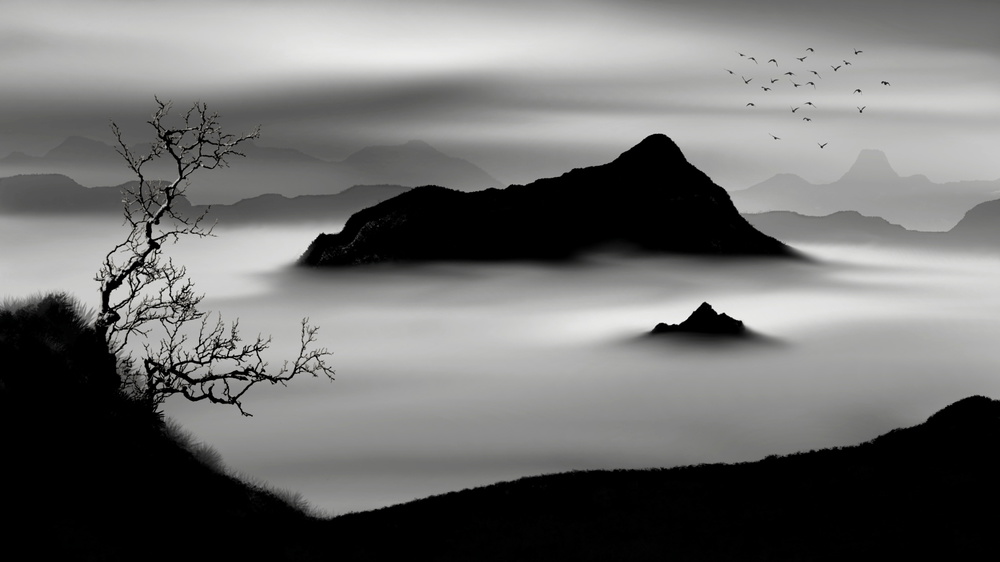 That was the time that the above image was created using a lot of experimentation. While it is not perfect, what makes it different to me is that - unlike most pictures of this kind, which are created from composite parts of other photos - this one is largely the result of painting. The mountains, the fog, the grass, the clouds ....all of them are painted by hand and they are not parts of different photos. When I started sharing this image online I have noticed a very positive response to it and also from magazine editors. Obviously I was very happy about it and ready to create more. For that reason this image has a special place in my heart. :)