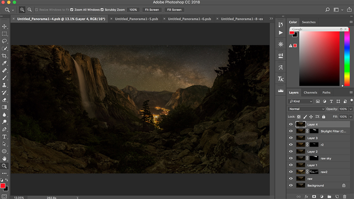 The last operation in this photo merging was to blend the sky part from Image 2 and the mountain and foreground part from Image 3 together, which finally generated Image 4. Image 4 also formed the starting basis for the following processing steps.