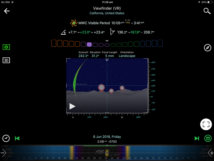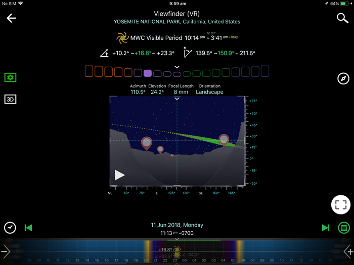 Plan 1 shows that on 8 June 2018, the moon rise would occur at 2:26am, while the Milky Way’s visible period would be from 10:09pm (7 June 2018) to 3:41am. So we would know that the best time to take our night sky shots with the Milky Way appearance would be around 10:30pm on 7 June 2018 to 2:20am (before moon rise) on 8 June 2018. But from the 3D viewfinder prediction of Plan 1, we also knew that in order to have mountain peaks in the middle of the frame, we probably had to wait around 2:00am to take our shots when the Milky Way was getting closer to the peaks.