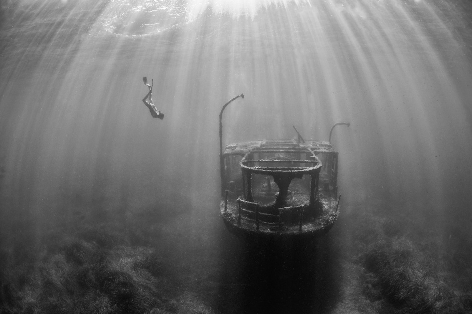 Deeper I fell and the density of life faded with the sunlight. Then, out of the increasing darkness came a surreal sight. A row of huge rubber truck tyres appeared, each one tethered by a rope from a sunken wreck below, straining towards the surface like the dead fingers of the drowned. The ropes that held them leading down to the depths were an enticing invitation to explore that was impossible to resist.