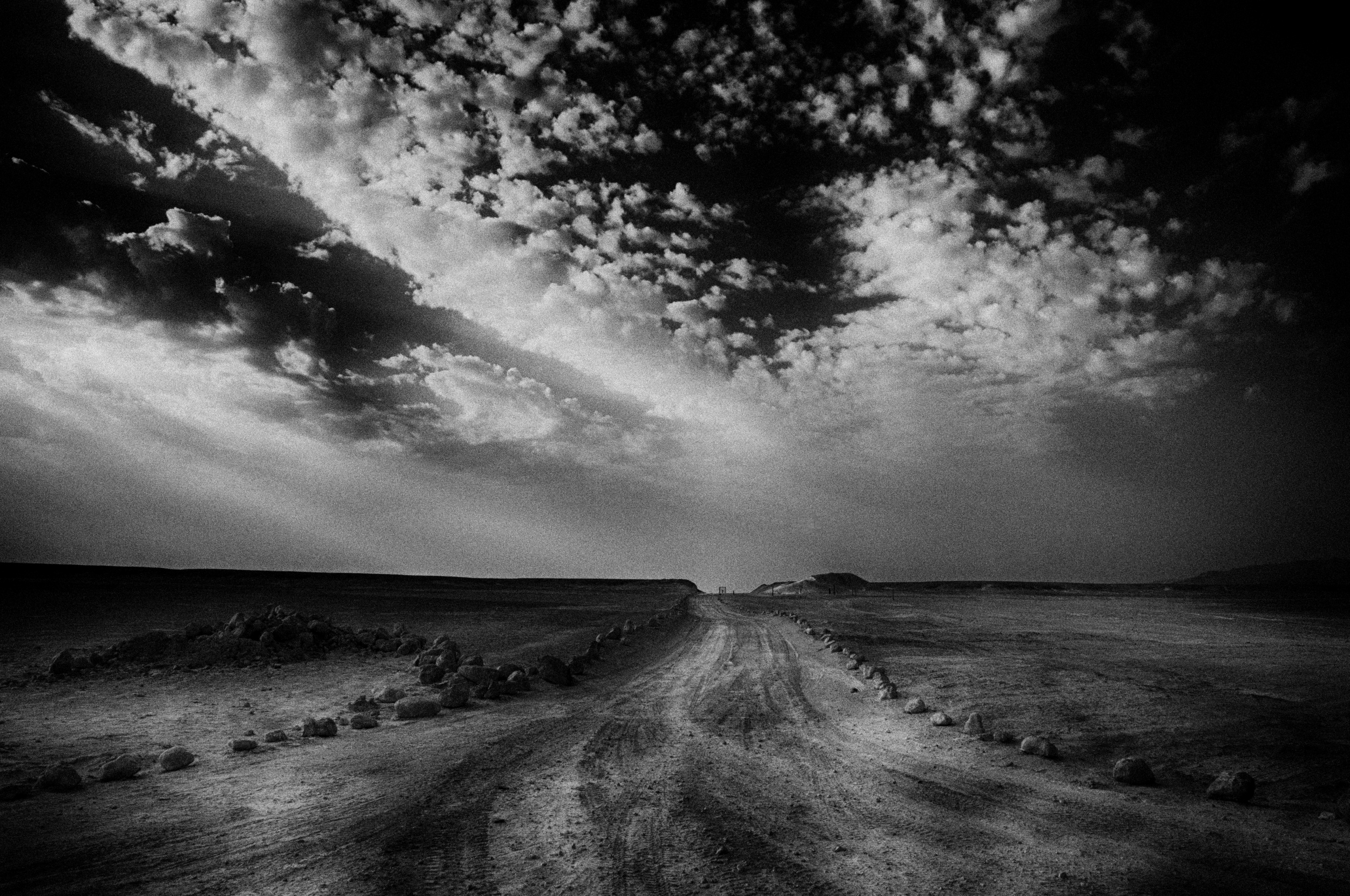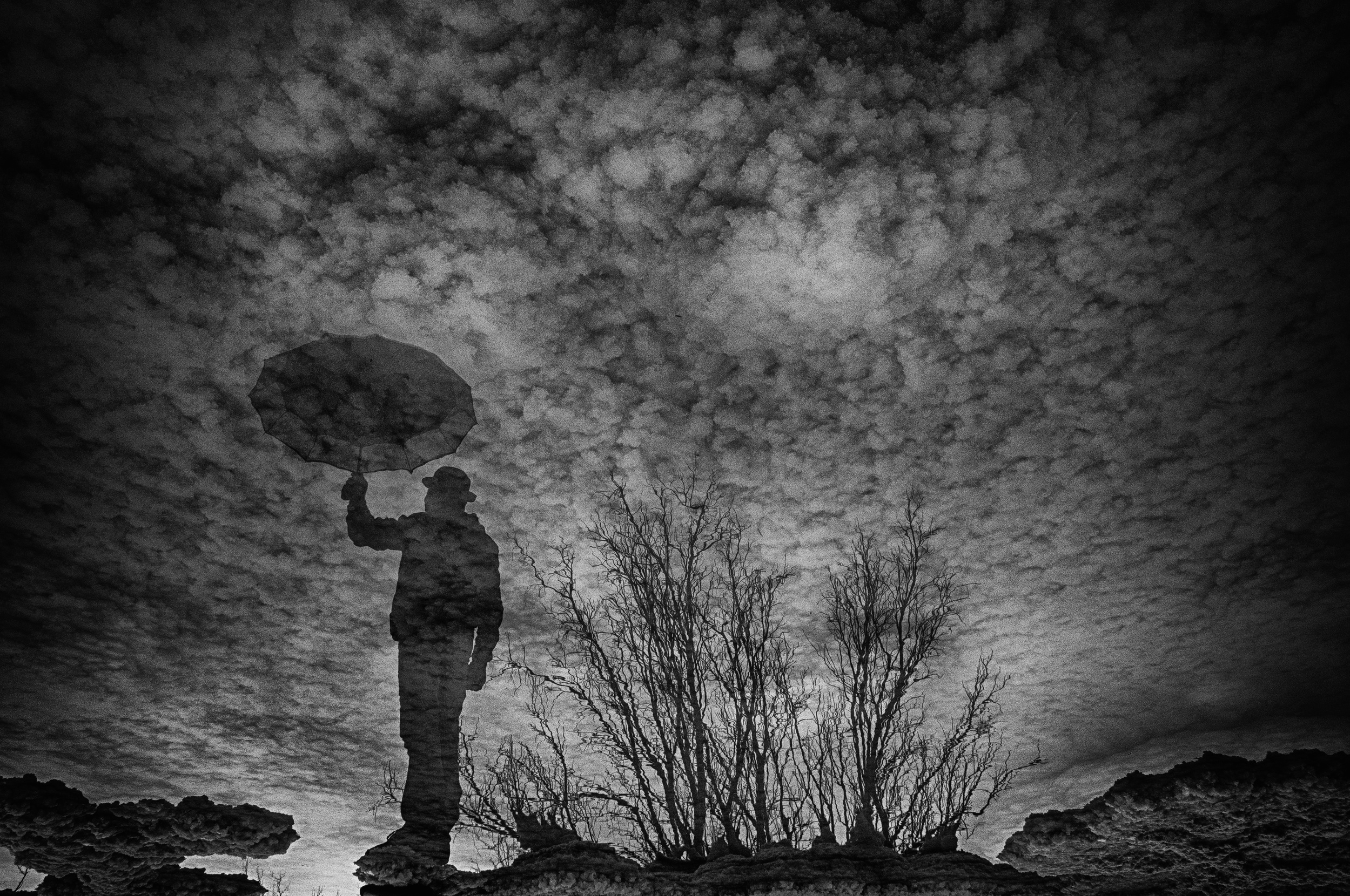 I was travelling with a friend in the Dead Sea area, or its original name, the Sea of Death. When my friend approached the water I saw his reflection and I immediately considered it as the subject of a story. The background with the fluffy clouds was special and I reinforced that special effect in Photoshop.