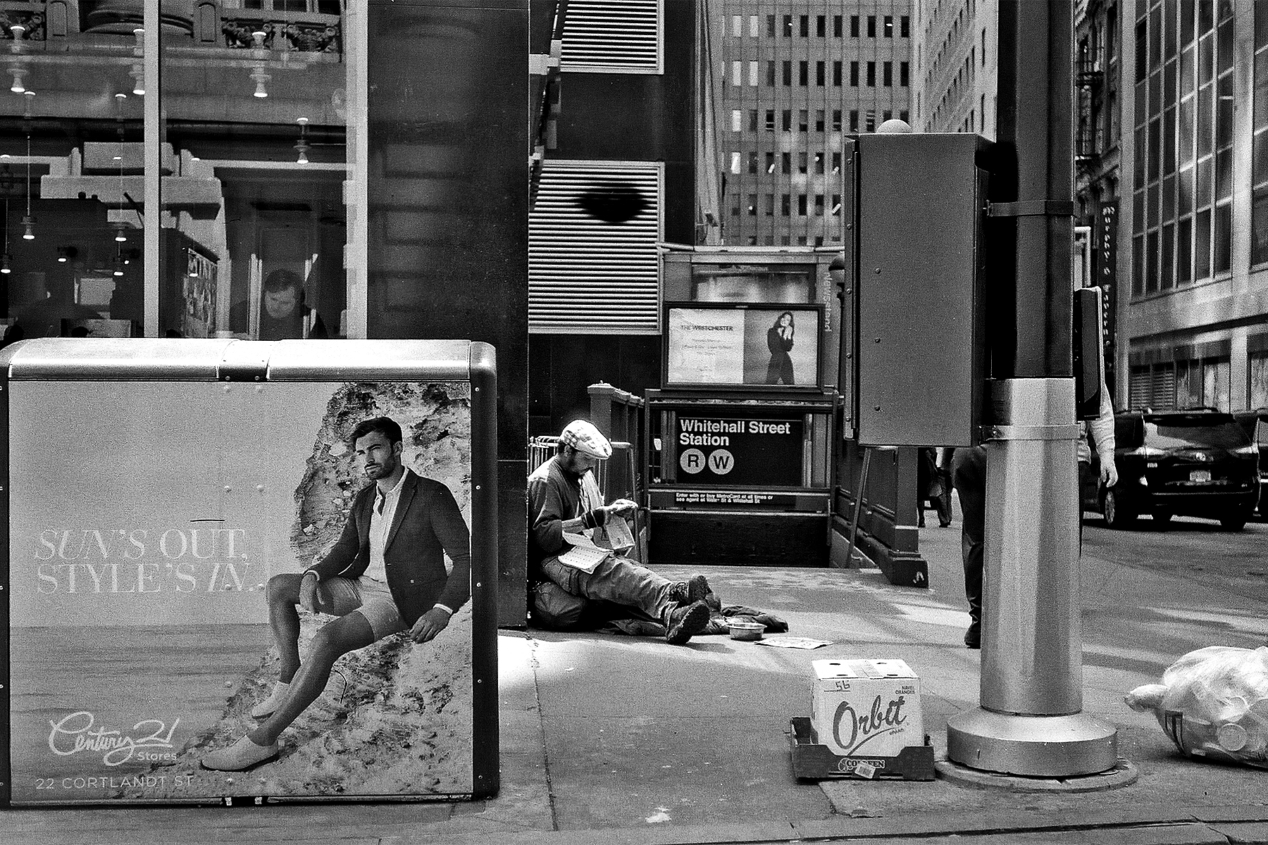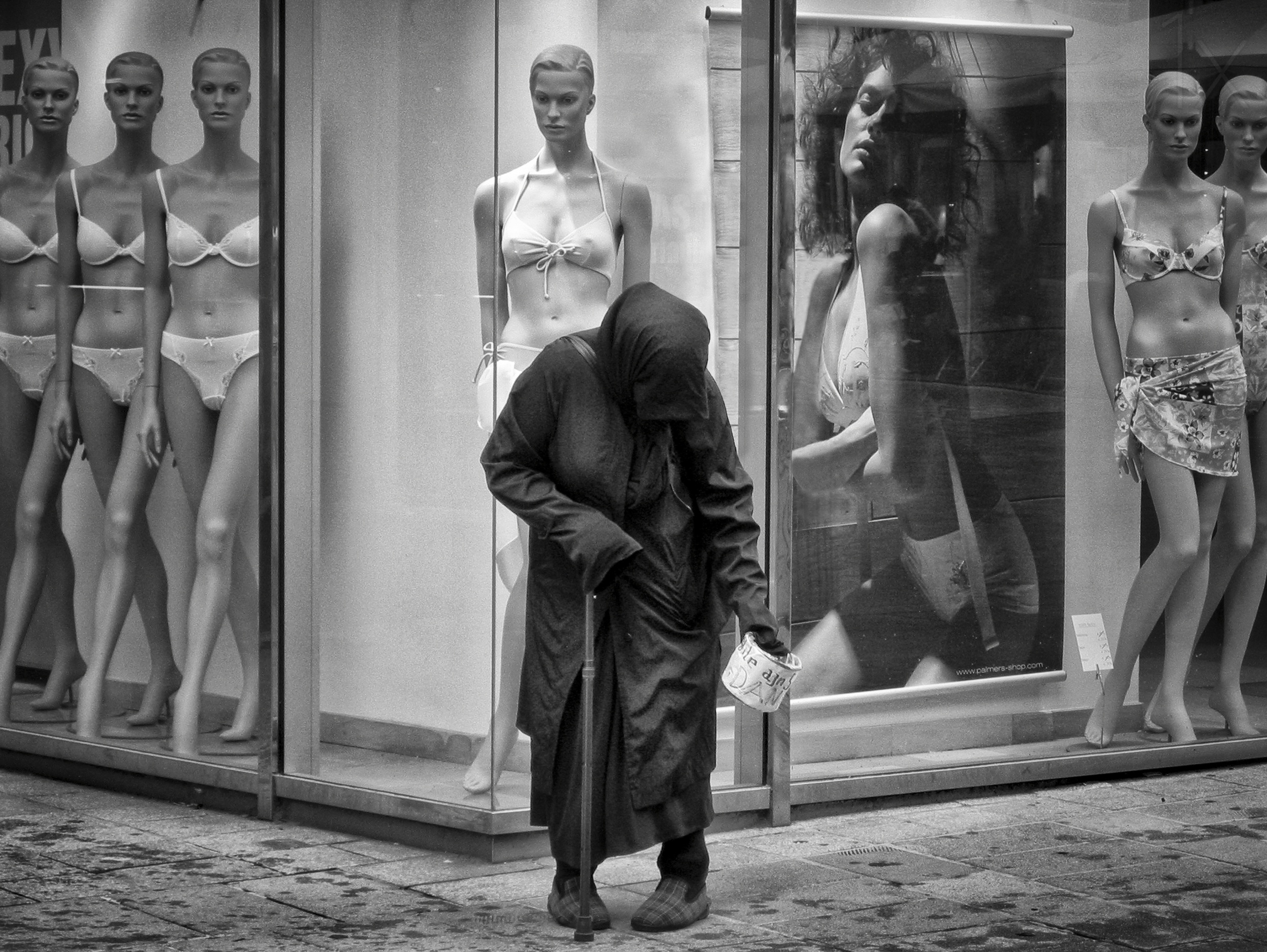 Poverty and opulence – contrasting scenes of poverty and wealth, such as a beggar in the street against a backdrop of an expensive clothing store can tell a multitude of stories