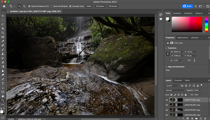 So, I simply switched my D850 to the interval shooting mode and set 300 successive shots continuously – the approach that I usually use for making a time-lapse. After about 5 minutes, the camera completed 300 multiple shots. In theory, this would achieve a 5- minutes long exposure effect after stacking all these frames together.