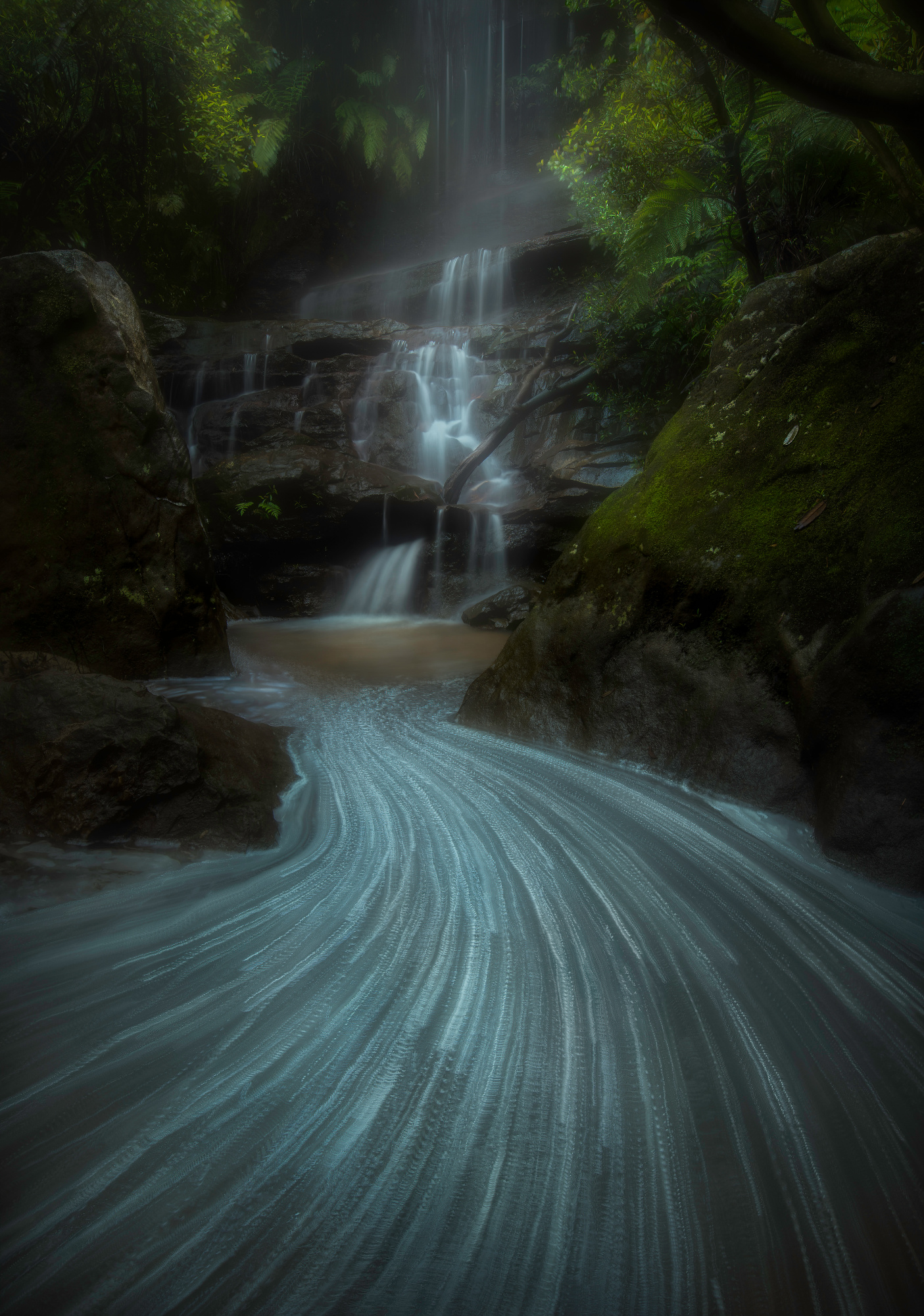 I observed that there is a little pond under the waterfall, where a creek down the hill is originated from there. Most of the times, the creek is too calm to show any interesting movement. But I know that under some extreme situations, the creek will add great features to the waterfall.
