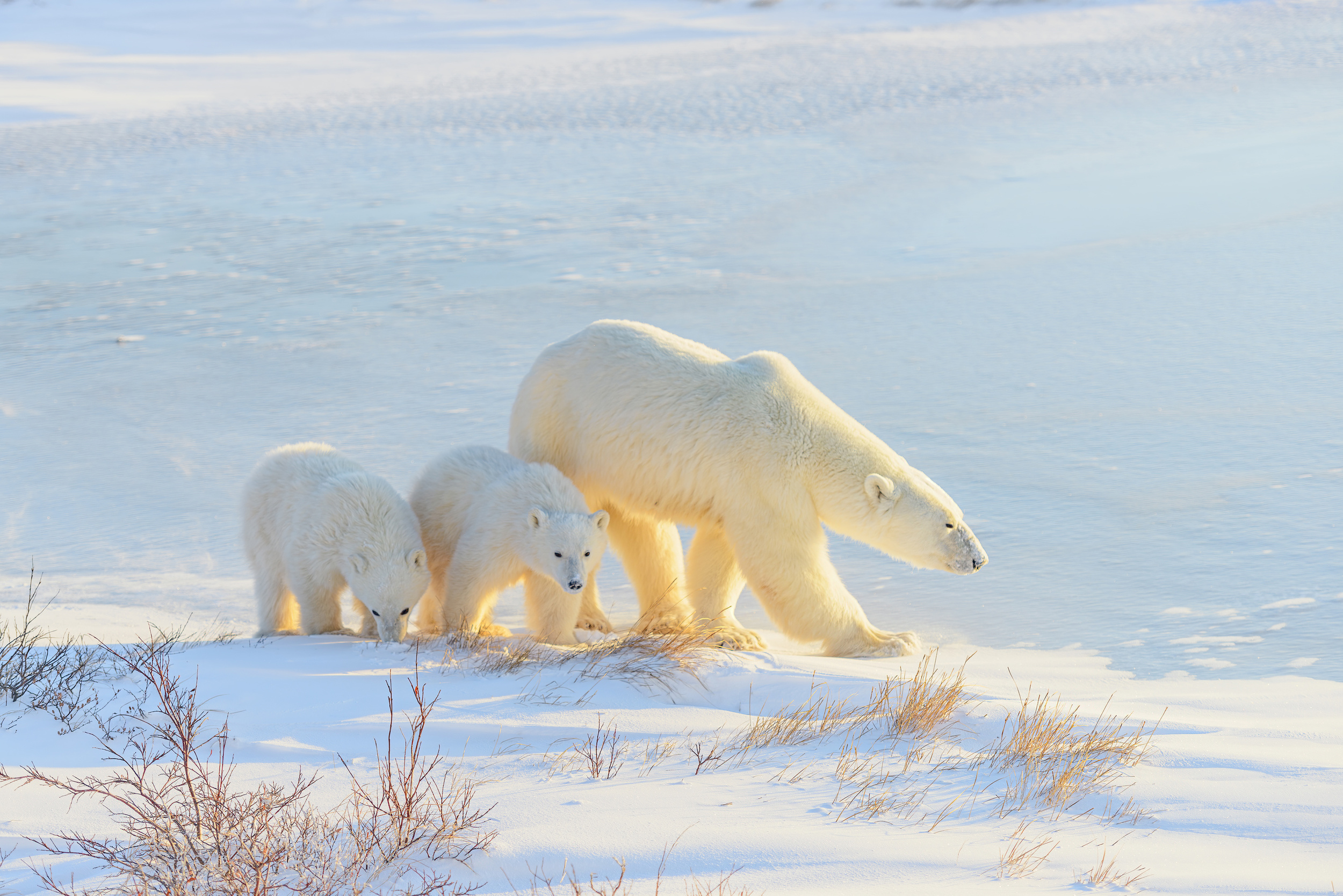 The temperature plummeted the night before, and we were informed that the bay had frozen over quickly. We were fortunate to spot this mother bear with her twins heading north towards the ocean ice, and felt a sense of relief and happiness, knowing they were on their way to the frozen bay to resume feeding and be in a safer environment.