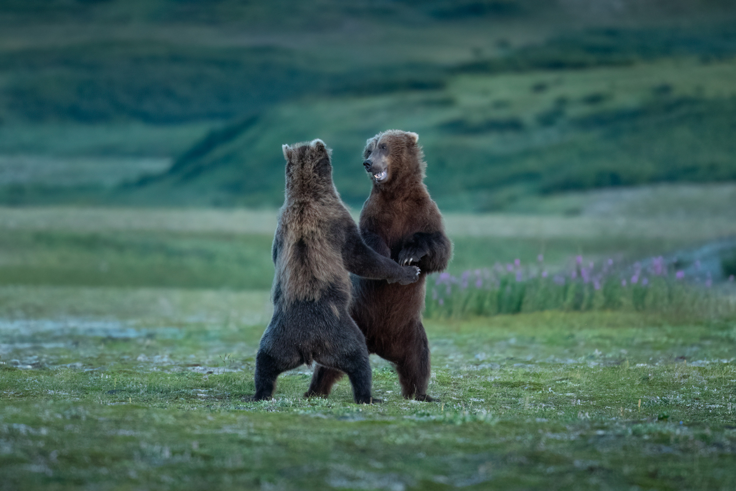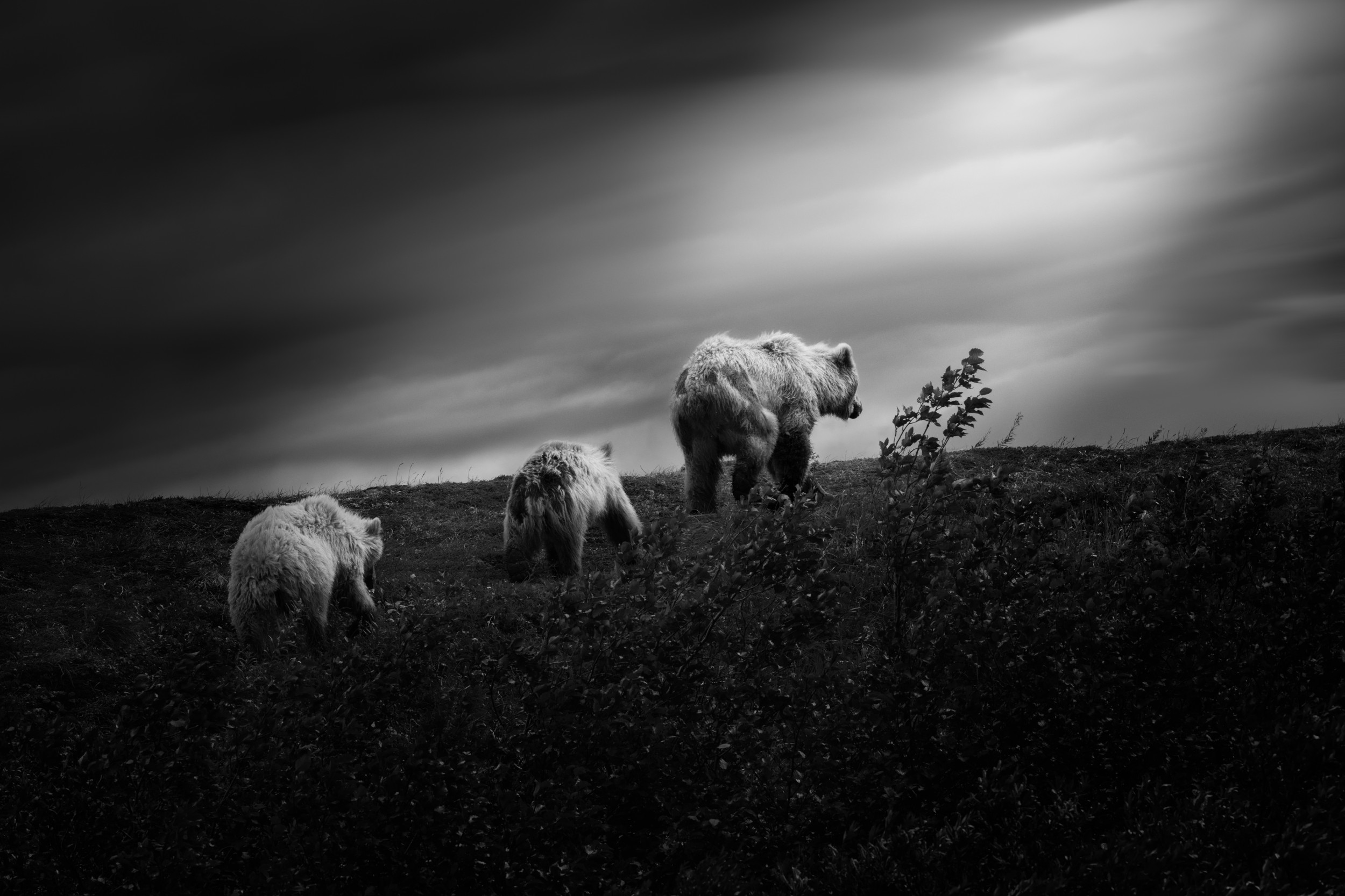 This isn't your typical wildlife photographer's pursuit – no fierce bear fights nor exciting fish-catching moments. The lighting falls short of spectacular, and any seasoned photographer would caution against shooting from the subject’s back. Yet, my heart resonated when I witnessed the unwavering devotion of two cubs trailing their mother wherever she led. While fellow photographers focused on the river, anticipating other bears' actions, I turned my camera around towards the departing bear family. Incorporating the clouds into the composition and employing a black-and-white technique, I discovered a satisfaction in capturing my emotions in this final image.
