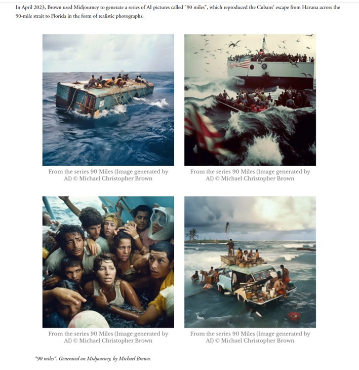 Photographer Michael Brown is a professional journalist and documentary filmmaker, and has been a photographer for National Geographic magazine since 2004. In April 2023, Brown used Midjourney to generate a series of AI pictures called "90 miles", which reproduced the Cubans' escape from Havana across the 90-mile strait to Florida in the form of realistic photographs.