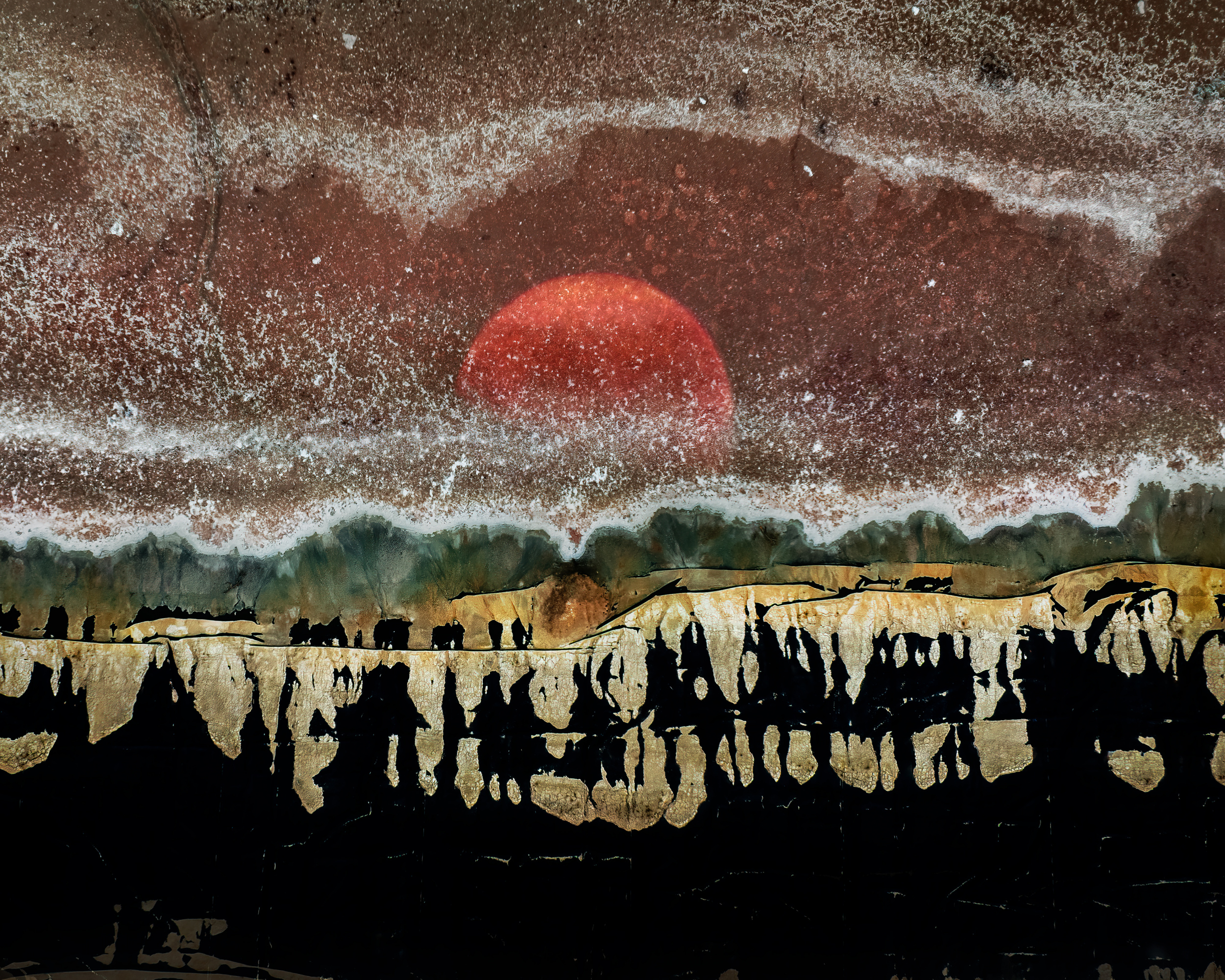 The sun in the picture connects past and present. This ancient sun shines on our ongoing modern wars now, with the same bloody red color as in the ancient battlefield. Just like a poem wrote by a famous Chinese poet Li bai twelve hundred years ago: “Today's people cannot see the ancient moon, but today's moon once shone on the ancient people”.