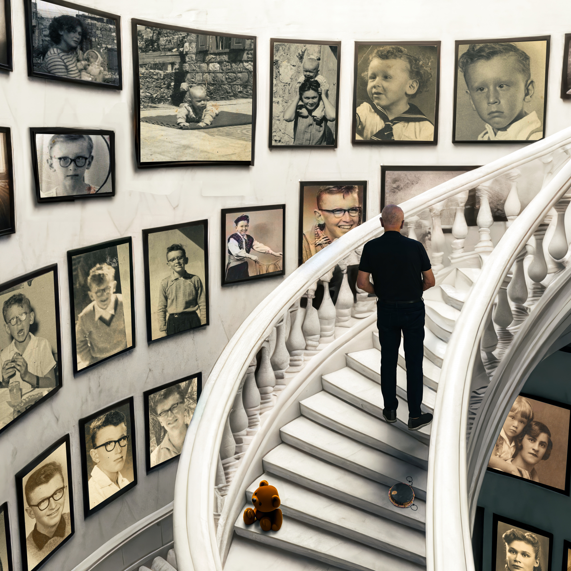 * Shooting (An Iterative Process): As both subject and creator, my shooting process is dynamic rather than a single session. I first establish the background, then capture an initial test shot of myself. After extracting my figure and placing it within the scene, I evaluate the position, perspective, and proportions. Based on this evaluation, I refine my poses and adjust angles repeatedly until everything is in harmony. Additional elements, such as props, are photographed separately to maintain consistency in lighting and perspective. Although I rely on natural light, I focus on refining direction and shadows later in Photoshop rather than achieving perfect lighting during the shoot.While this process is highly structured, I wholeheartedly embrace moments of spontaneous experimentation that often lead to unexpected creative breakthroughs. A good example of this is my image The Wings of Forgetting, where I initially completed the composition before deciding to incorporate an image of my younger self, gazing at the adult version of me. This last-minute addition not only altered the narrative depth of the image but also required me to redo portions of the post-processing to seamlessly integrate the new element.